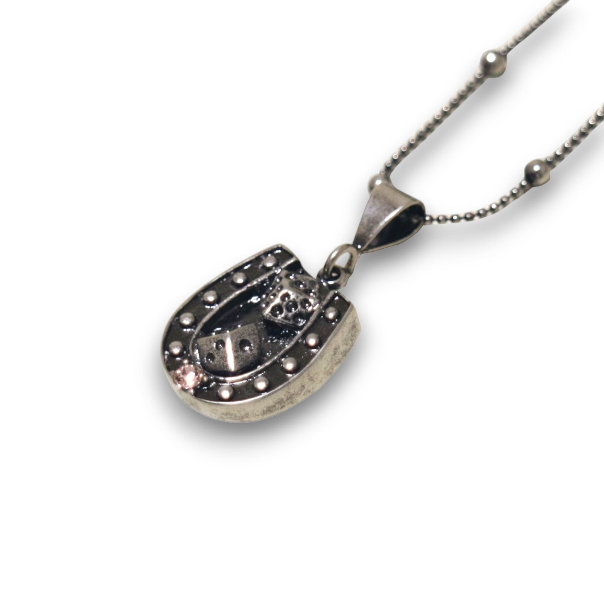 幸運をもたらすホースシュー(馬蹄)とダブルダイスモチーフが首元でスイングするクールなネックレスです
