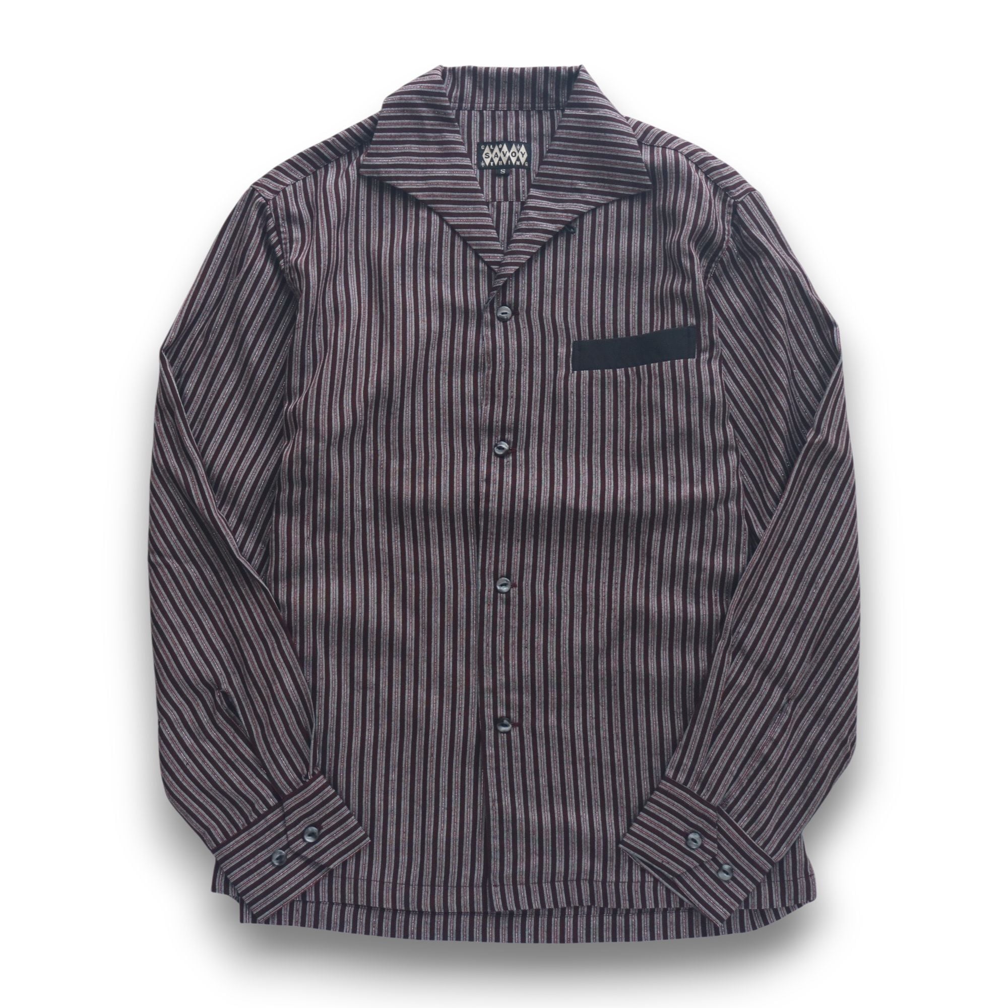 ワインとシルバーのストライプベースにシルクのシルバーラメが入ったストライプのイタリアンカラーシャツです