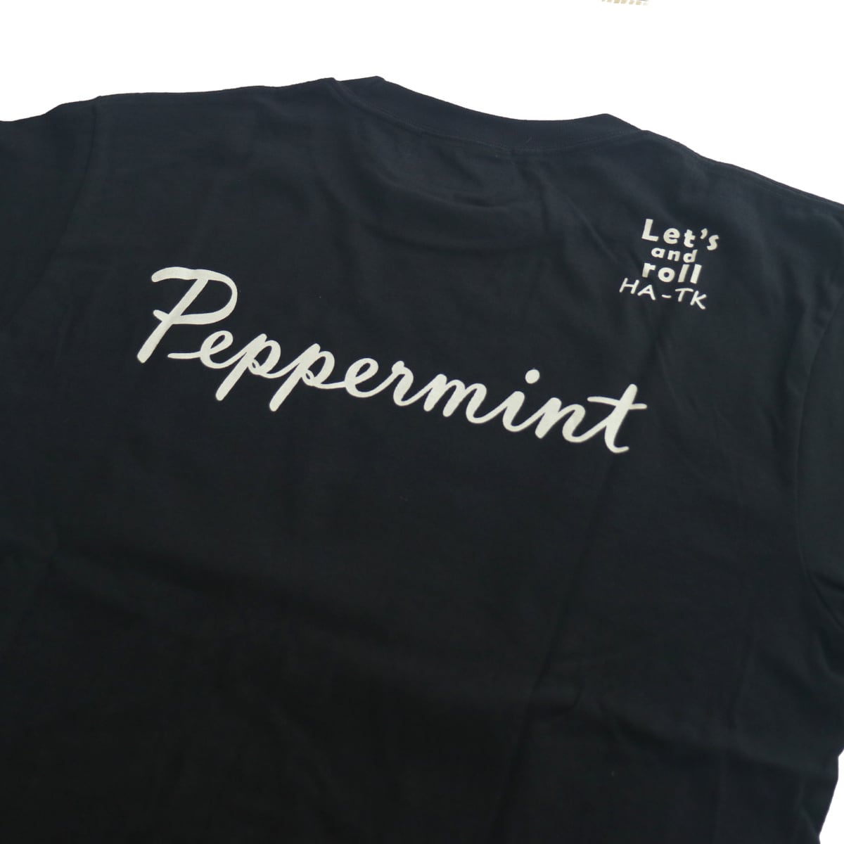 背中には筆記体ペパーミントの文字ロゴ、タグはコブラタグが付きます